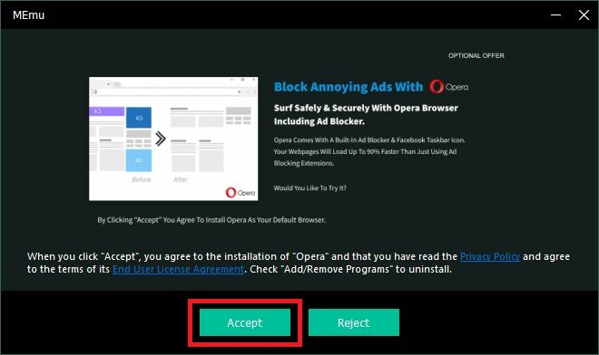 Xác nhận tuân theo điều khoản và điều kiện của Memu App Player bằng cách chọn “Accept”.