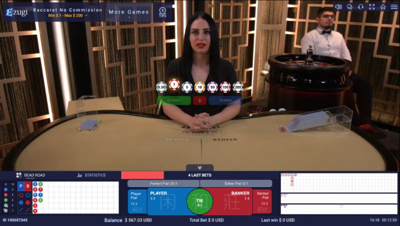 Đây là game bài Baccarat của nhà phát hành Ezugi cho bạn cơ hội đánh bài trực tiếp với nhà cái. Cược đặt cho nhà cái sẽ được trả theo tỷ lệ 1 ăn 1 thay vì 1 ăn 0.95 (0.05 là số tiền hoa hồng hưởng lợi của nhà cái), thế nên mới gọi là No Commission (không hoa hồng). Luật chơi thì như game Baccarat bình thường thôi.