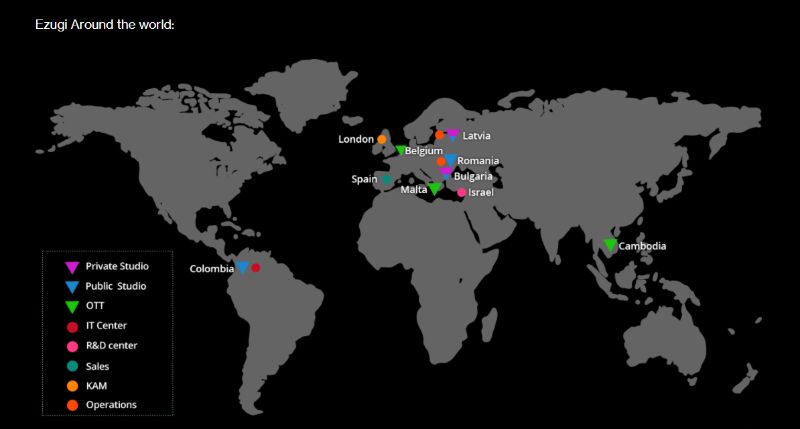 Ezugi có tới 9 cái Studio nằm tại các địa điểm khác nhau trên toàn thế giới – bao gồm Châu Âu, Châu Á và Châu Mỹ Latinh để cung cấp game sòng bài online cho khách hàng. Các Studio luôn luôn được mở 24/7 để đảm bảo người chơi có thể truy cập thoải mái không hạn chế vì các nơi trên thế giới có các múi giờ khác nhau.