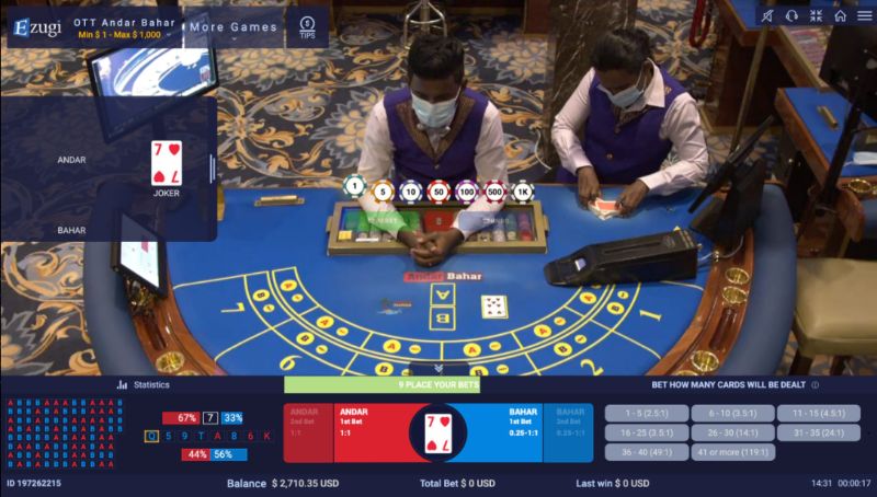 Andar Bahar là một trong những game Casino nổi tiếng nhất Ấn Độ. Trò chơi được livestream trực tiếp từ Live Studio Flagship của Ezugi đặt tại Romania, đảm bảo mang lại sự phấn khích và giải trí cực đã cho người chơi.