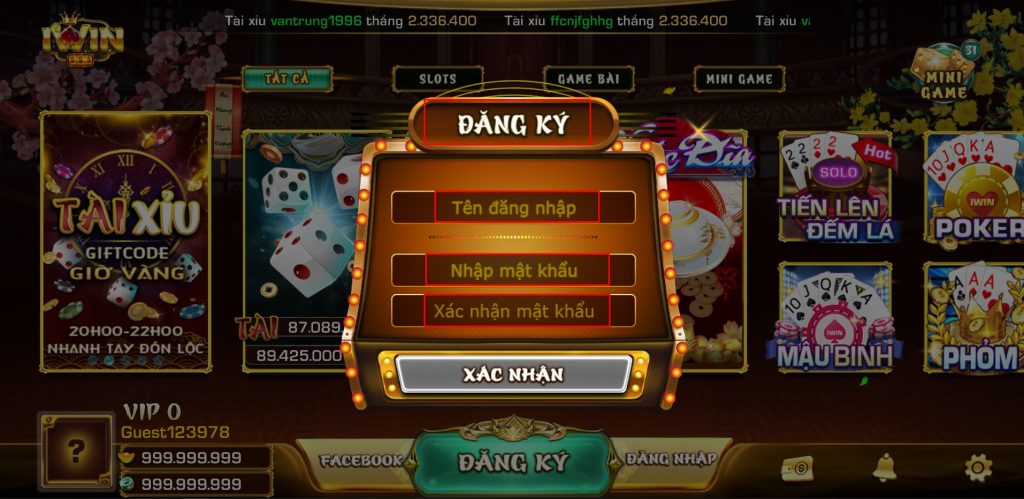 Vẫn truy cập vào iWIN Club như bình thường. Tại đây chúng ta hãy chọn mục Đăng ký. Hãy điền Tên đăng nhập và Mật khẩu. Sau đó ấn Xác nhận là chúng ta đã tạo thành công tài khoản chơi của nhà cái này