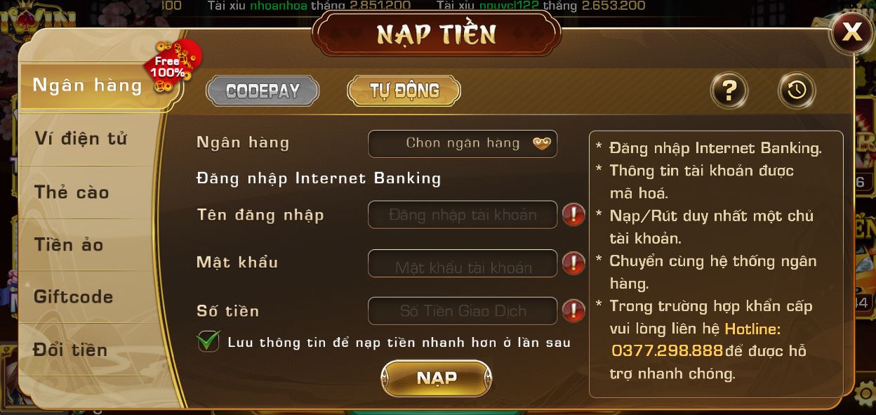 Chuyển tiền vào iWIN Club qua hình thức Tự động