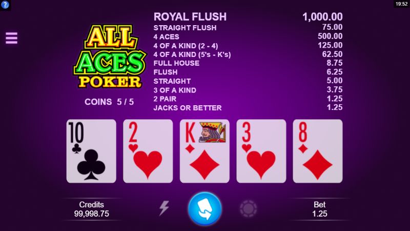 Là một game Poker đơn giản và thú vị, All Aces Poker cuốn hút người chơi nhờ gameplay nhanh gọn lẹ không hề rườm rà một chút nào. Sau khi đặt cược, 5 quân bài trên bàn sẽ được mở. Nếu như kết quả của 5 lá bài đáp ứng được với mức trả thưởng trong game thì người chơi sẽ được nhận phần thưởng tương ứng.