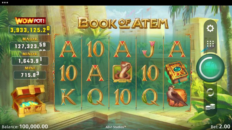 Bảng kết quả trong game Book of Atem có hình dạng 3×5 (3 dòng 5 cột) với tổng cộng 10 dòng trả thưởng. Trong Vòng quay miễn phí, người chơi có cơ hội nhận được phần thưởng lên đến 5.000 lần mức cược. 3 biểu tượng Scatter xuất hiện sẽ cho bạn 10 lượt quay miễn phí cực đã. Để ăn được phần thưởng nổ hũ trong game là không dễ thế nhưng chỉ cần ăn một cái hũ to nhất WOW POT! là đủ tiêu cả tháng luôn.