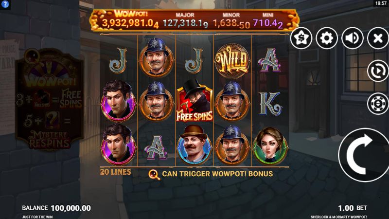 Bảng kết quả trong game slot Sherlock & Moriarty có hình dạng 3×5 (3 dòng 5 cột) với tổng cộng 20 dòng trả thưởng. Với 3 biểu tượng Scatter, người chơi sẽ nhận được 10 lượt quay miễn phí. Nếu như đang quay miễn phí mà lòi ra thêm 3 biểu tượng Scatter nữa thì được cộng thêm 2 lượt quay cho mỗi biểu tượng Scatter, tối đa là 10 lượt quay. Hãy dồn tất cả sức mạnh của mình vào Vòng quay may mắn với giá trị cực khủng đang chờ đón bạn.
