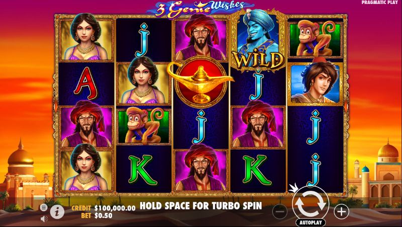 3 Genie Wishes là một game slot có bảng kết quả 4×5 (4 dòng 5 cột) với tổng cộng 50 dòng trả thưởng tất cả. Biểu tượng Genie (Thần đèn) được xếp trong tất cả các cột và có thể dùng để thay thế cho tất cả những biểu tượng khác. Khi bạn tìm được chiếc đèn thần, thần đèn sẽ hiện ra và cho bạn ba điều ước – Vòng quay miễn phí Raining Wild, Vòng quay miễn phí Sticky Wild, hoặc trực tiếp nhận phần thưởng tiền mặt có giá trị lớn.