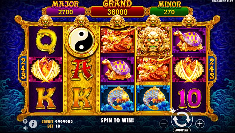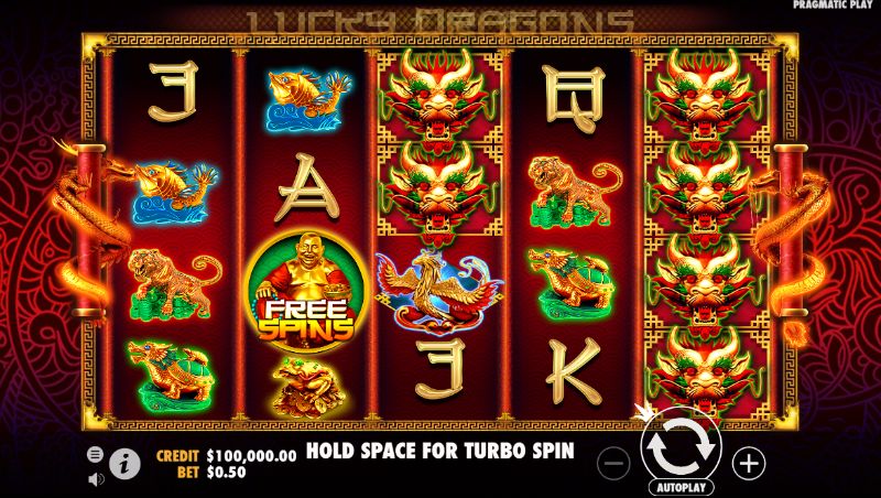 Khi biểu tượng Lucky Dragons bay vút lên trời cũng là lúc mà bạn ăn được số tiền thưởng cực khủng. Bảng kết quả trong game có hình dạng 4×5 (4 dòng 5 cột) với tổng cộng 50 dòng thắng tất cả. Khi kích hoạt tính năng VÒNG QUAY MIỄN PHÍ, một biểu tượng WILD sẽ được thêm vào cột 2, 3 và 4 trước khi bắt đầu mỗi vòng quay và mỗi khi bạn quay trúng biểu tượng Scatter trong vòng đó, bạn sẽ được thưởng thêm một vòng quay miễn phí nữa.