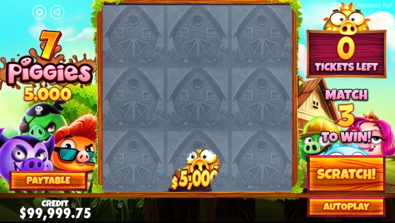 7 Piggies Scratchcard cũng là một game cào thưởng vừa mới được ra lò của nhà phát hành Pragmatic Play. Bạn sẽ chiến thắng khi có 3 biểu tượng giống nhau xuất hiện và có cơ hội nhận được giải thưởng cao nhất là 5.000.
