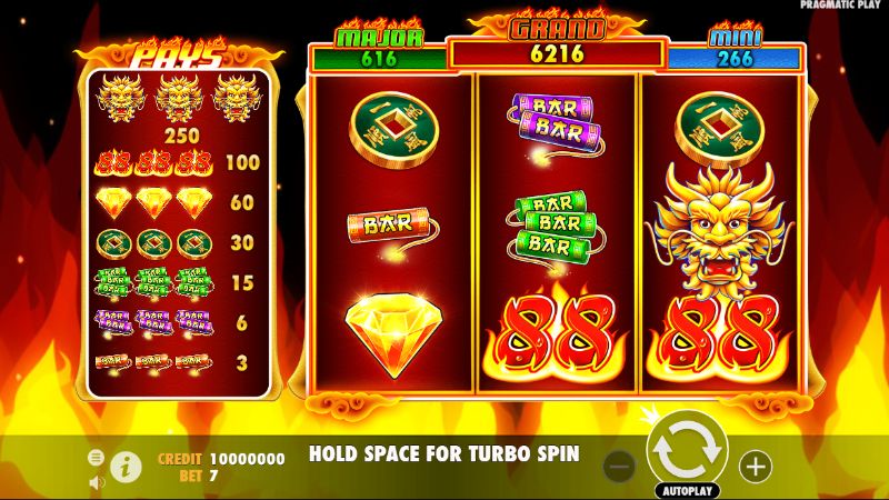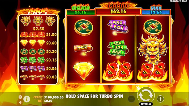 Sức nóng của Fire 88 là không thể chối từ. Phần thưởng hấp dẫn, lối chơi cổ điển với bảng 3×3 theo chủ đề đất nước Trung Quốc. Mức thưởng cao nhất trong game lên đến 888 lần mức cược. Người Trung Quốc rất chuộng số 8 nên tựa game này nhìn đâu cũng thấy số 8 luôn. Càng cược nhiều thì phần thưởng nổ hũ càng to.