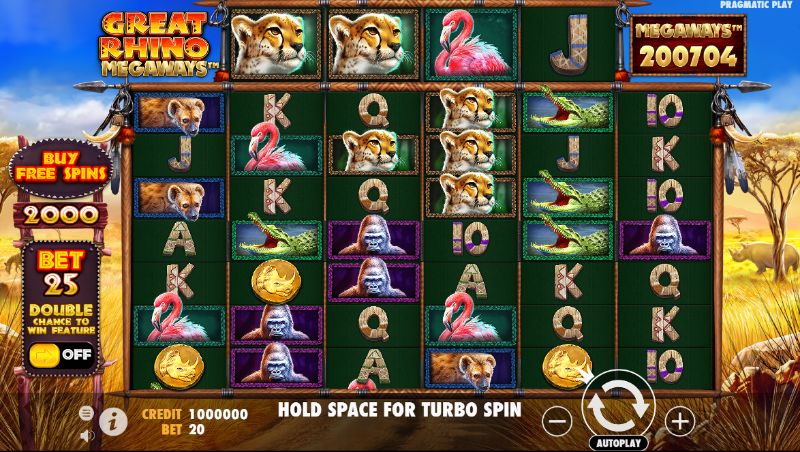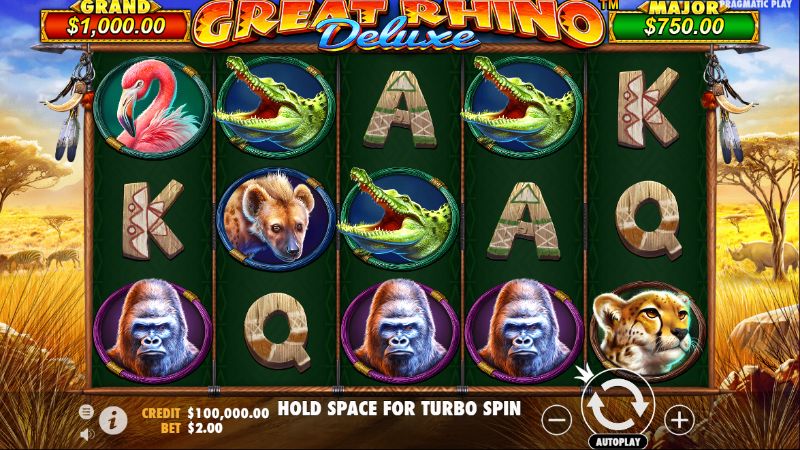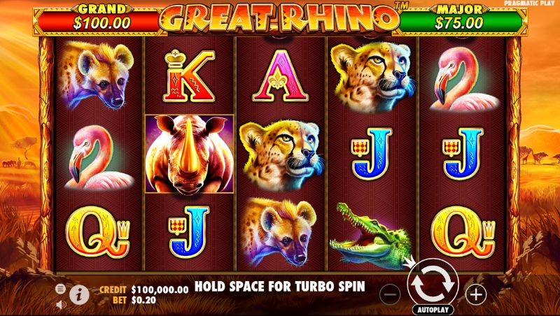 Người chơi phải tham gia cuộc chiến để có thể thắng lợi trong game Great Rhino. Bảng kết quả trong game có hình dạng 3×5 (3 dòng 5 cột) với tổng cộng 20 dòng trả thưởng. Biểu tượng Bonus chỉ xuất hiện ở cột 2, 3 và 4 với cơ hội mang đến rất nhiều lượt quay miễn phí cho người chơi. Có 2 mức Nổ hũ trong game, hũ Major đem lại phần thưởng lên đến 375 lần tiền cược, hũ Grand đem lại phần thưởng lên đến 500 lần tiền cược.