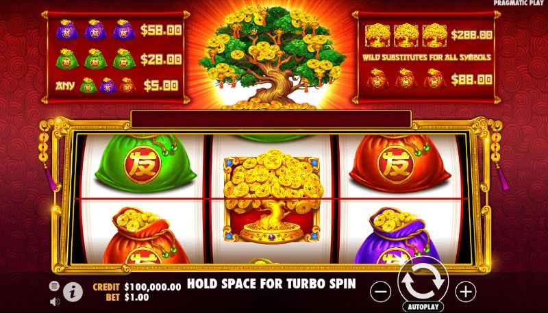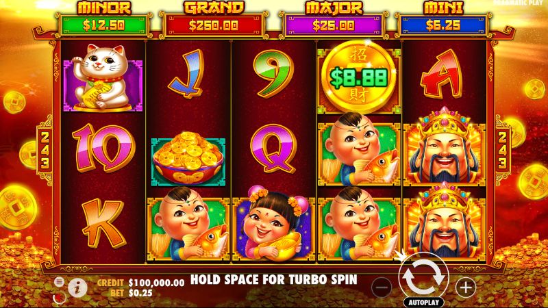 Nếu may mắn thì Thần Tài sẽ mỉm cười với bạn trong game slot Caishen’s Gold. Bảng kết quả trong game có hình dạng 3×5 (3 dòng 5 cột) với 243 dòng trả thưởng tất cả. Biểu tượng Caishen (Thần Tài) sẽ đóng vai trò như biểu tượng WILD, mỗi khi biểu tượng đó xuất hiện trên màn hình là người chơi sẽ được tặng ngẫu nhiên một Jackpot Bonus Game (minigame). Để chơi bạn phải chọn và lật những biểu tượng giống nhau để nhận được một trong những phần thưởng nổ hũ của trò chơi.
