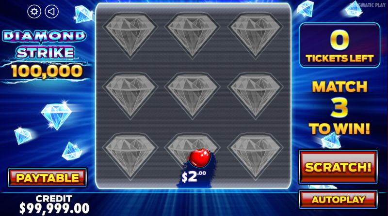 Trong game Diamond Strike Scratchcard, bạn sẽ sẽ chiến thắng khi có 3 biểu tượng giống nhau xuất hiện và có cơ hội nhận được giải thưởng cao nhất là 100.000.