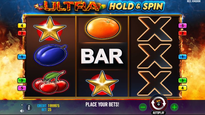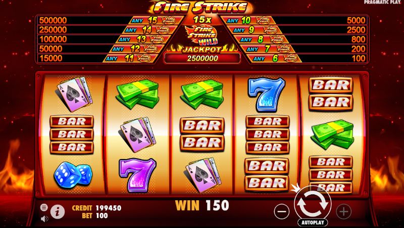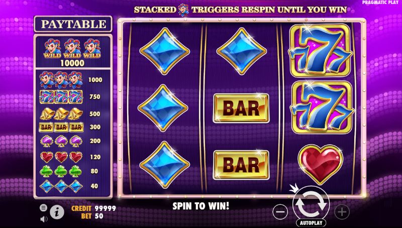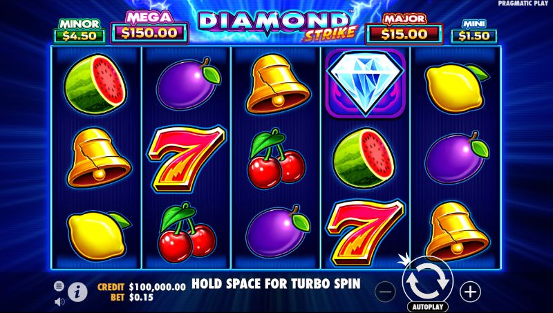 Cùng săn tìm những phần thưởng jackpot nổ hũ trong game slot Diamond Strike. Bảng kết quả trong game có hình dạng 3×5 (3 dòng 5 cột) với 15 dòng trả thưởng tất cả. Những biểu tượng kim cương sẽ thay thế cho biểu tượng WILD và được xếp kín nguyên một cột. Khi bạn kích hoạt Vòng quay miễn phí, game sẽ bổ sung thêm nhiều biểu tượng kim cương mang lại phần thưởng giá trị. Khi quay trúng 3 biểu tượng số 7 bằng vàng, bạn sẽ có cơ hội ăn nổ hũ với phần thưởng gấp 1000 lần số tiền cược.