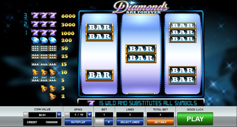 Hãy thử chơi tựa game slot Diamonds Are Forever 3 Lines để trải nghiệm phong cách chơi máy slot truyền thống nhé, cùng với đó bạn sẽ hiểu ngay tại sao người ta hay nói kim cương là người bạn tốt nhất của phụ nữ. Nếu như bảng kết quả trả về dãy biểu tượng trùng với bảng bên trái là bạn sẽ được nhận mức thưởng tương ứng.