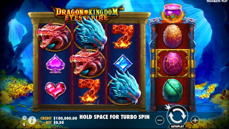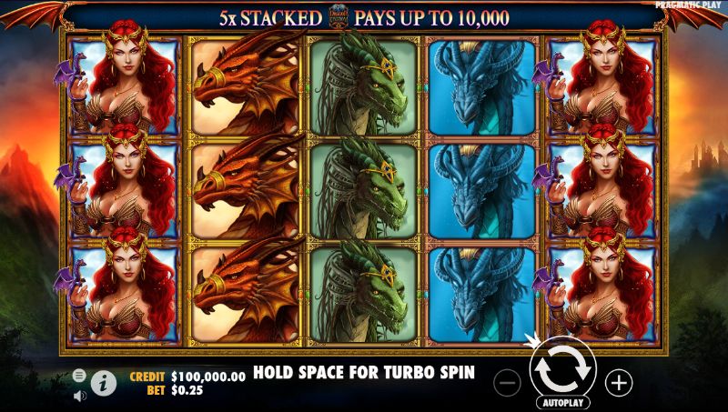 Hãy đi săn tìm hang ổ của loài rồng trong game Dragon Kingdom. Bảng kết quả trong game có hình dạng 3×5 (3 dòng 5 cột) với 25 dòng trả thưởng tất cả. Khi 3 biểu tượng Scatter được mở ra sẽ được thưởng 5 lượt quay miễn phí.