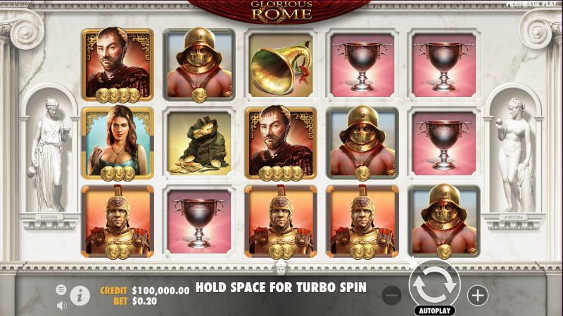 Cùng tham gia vào quá trình xây dựng xã hội thịnh vượng của Đế chế La Mã trong tựa game slot Glorious Rome. Bảng kết quả trong game có hình dạng 3×5 (3 dòng 5 cột) với tổng cộng 20 dòng thắng. Cùng gặp gỡ những nhân vật như Emperor (Hoàng đế), Vestal Virgin (Nữ tư tế), Centurion (Bách phu trưởng) và Gladiator (Võ sĩ giác đấu) để nhận được phần thưởng giá trị.
