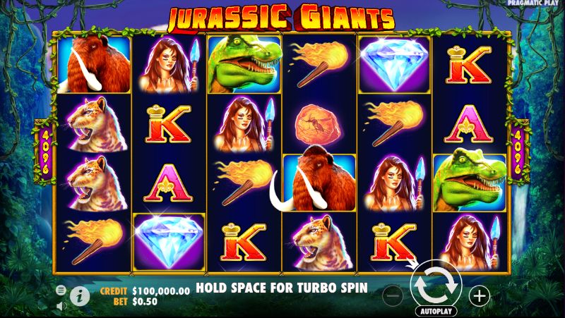 Hãy khám phá những khu rừng thời tiền sử trong game slot Jurassic Giants. Bảng kết quả trong game khá to với hình dạng 4×6 (4 dòng 6 cột) với 4096 dòng trả thưởng. Trận chiến giữa khủng long T-Rex (bạo chúa) hung tợn và voi Mammoth dũng mãnh vẫn đang diễn ra và bạn sẽ là người quyết định. Nếu có 20+ biểu tượng Scatter là người chơi có cơ hội ăn ngay 250 lượt quay miễn phí chơi tới sáng hôm sau luôn.