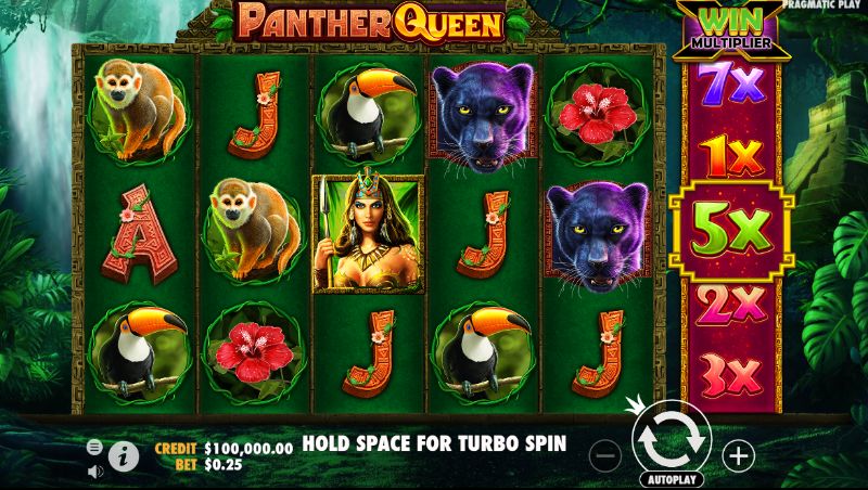 Hãy cùng khám phá kho báu của bộ tộc Amazon trong game slot Panther Queen. Bảng kết quả trong game có hình dạng 3×5 (3 dòng 5 cột) với tổng cộng 25 dòng thắng, cùng với đó là một cột phụ bên cạnh để xác định hệ số nhân thưởng trong lượt quay. Khu rừng già và đền thờ cổ xưa là những nơi chứa đầy kho báu đồng thời cũng vô cùng nguy hiểm, liệu bạn có đủ bản lĩnh để chiếm lấy nó và giàu có về sau?
