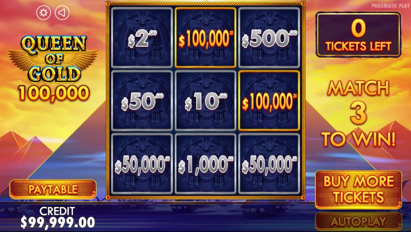 Queen of Gold Scratchcard được Pragmatic Play phát hành cách đây không lâu và là một trong 7 game cào thưởng trong danh mục họ . Những trò chơi này đều được thiết kế dựa trên những game slot phổ biến nhất của nhà phát hành. Bạn sẽ chiến thắng khi có 3 biểu tượng giống nhau xuất hiện và có cơ hội nhận được giải thưởng cao nhất là 250.000.
