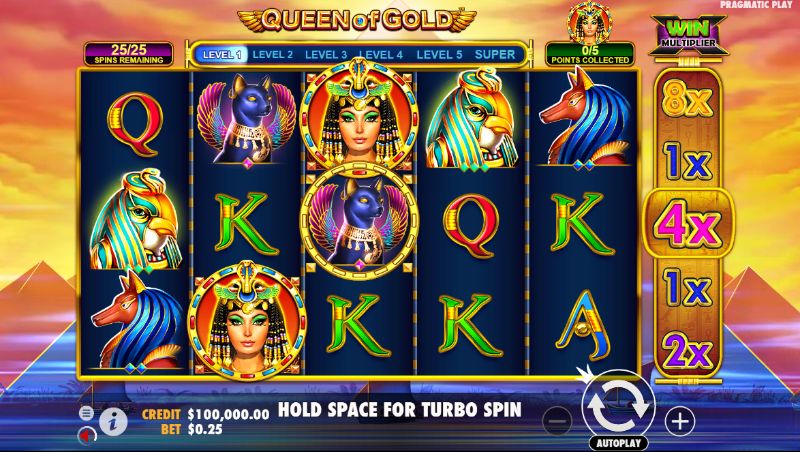 Cùng lên đường tìm kiếm kho báu trong tựa game slot Queen of Gold. Bảng kết quả trong game có hình dạng 3×5 (3 dòng 5 cột) với 25 dòng thưởng tất cả. Khi tìm kiếm trong kim tự tháp, hãy chọn một ô may mắn sau đó cố gắng quay sao cho biểu tượng Nữ hoàng rơi vào ô đó để nhận được điểm thưởng và tiếp tục cuộc hành trình. Bạn sẽ có vô số cơ hội nhận tiền thưởng trong trò chơi này.