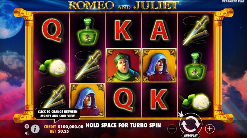 Không điều gì có thể ngăn cản tình yêu cả, tiền bạc cũng vậy. Romeo và Juliet trong tựa game slot này không còn là tình yêu nữa mà chỉ toàn tiền tài vàng bạc thôi. Nếu 2 biểu tượng Romeo và Juliet được xếp cùng một cột thì bạn sẽ được thưởng 25 lượt quay miễn phí cực đã.