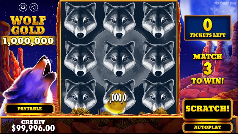 Wolf Gold là một game cào thưởng rất thú vị, thậm chí giải thưởng của nó cũng cao nhất trong tổng số 7 game cào thưởng của nhà phát hành Pragmatic Play (tất cả đều được thiết kế dựa trên những game slot phổ biến nhất của họ). Bạn sẽ chiến thắng khi có 3 biểu tượng giống nhau xuất hiện và có cơ hội nhận được giải thưởng cao nhất là 1.000.000. Muốn chơi được thì đầu tiên phải mua vé đã.