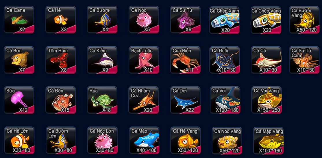 Mỗi chú cá mà bạn săn được trong Bá Chủ Đại Dương 3D sẽ mang về cho bạn một phần thưởng với hệ số khác nhau. Cá càng lớn hệ số ăn thưởng càng cao và ngược lại. Hệ số sẽ được nhân cho số tiền cược mà bạn lựa chọn loại đạn bắn ra để thưởng tiền. Dưới đây là bảng hệ số ăn thưởng của các loại Cá mà bạn săn được: